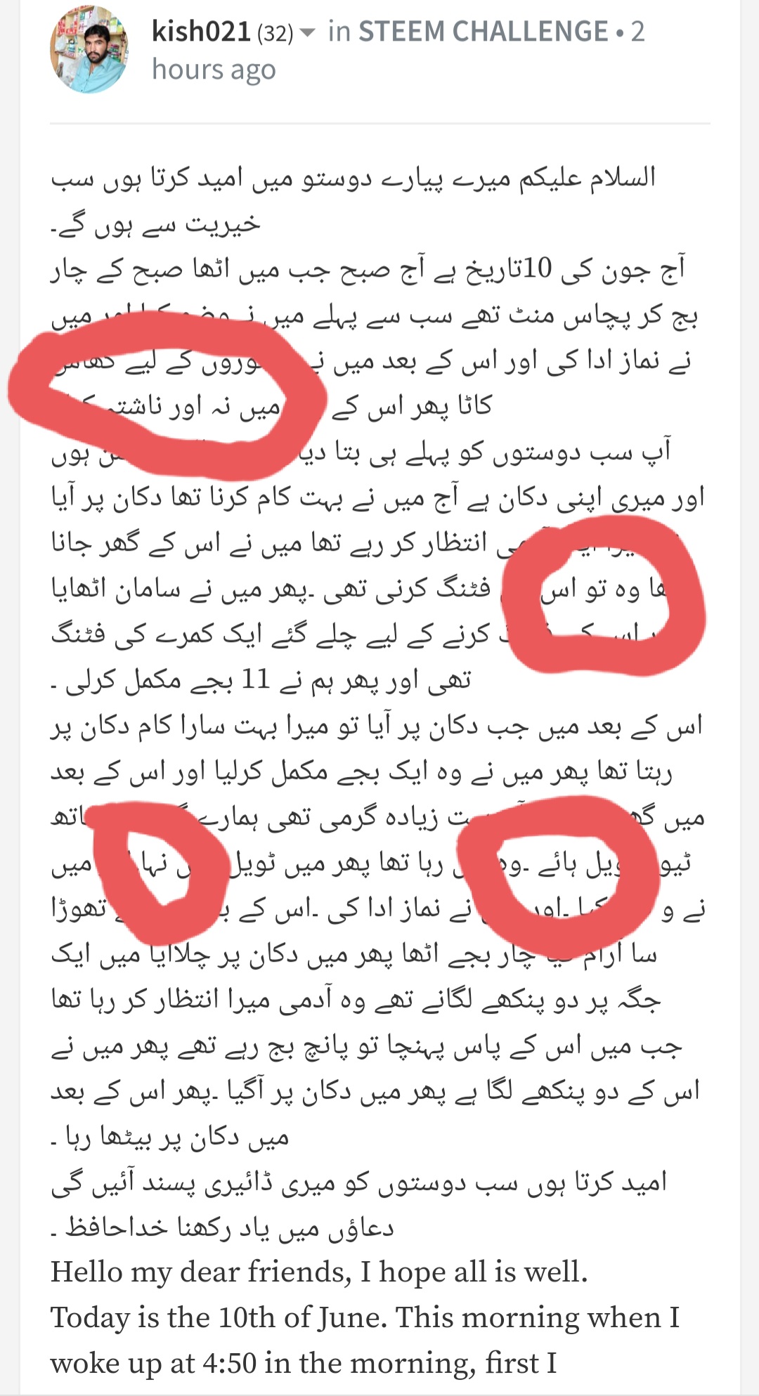 Today is the 10th of June. This morning when I woke up at 4:50 in the morning, first I performed Wudhu and I prayed and then I cut the grass for the animals and then I did not have breakfast. ۔