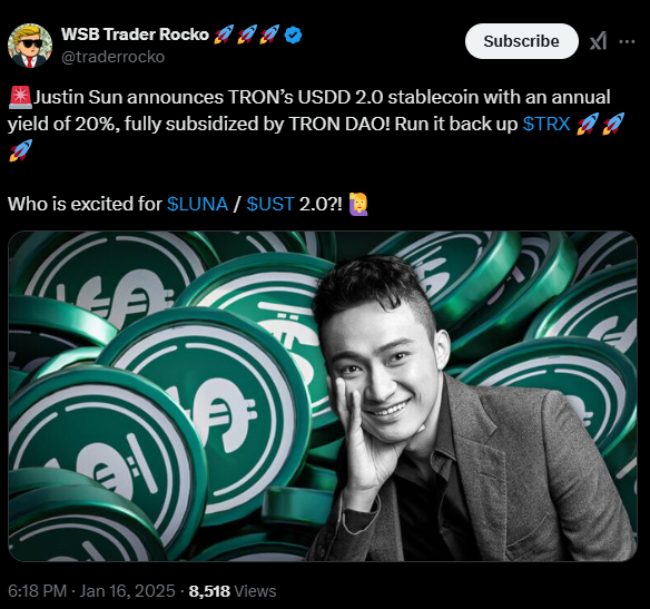 USDD 2.0 was announced by Justin Sun, the founder of TRON, on January 15, 2025. The new version aims to be a refreshed and improved iteration of the original USDD stablecoin. USDD 2.0 promises a 20% APY, which is fully subsidized by TRON DAO reserves. This high yield is intended to attract investors by offering substantial passive income, much higher than what traditional savings accounts or even other stablecoins in the market provide. All interest payments for USDD 2.0 will be sent in advance to a transparent address to ensure trust and transparency. The yield is backed by the financial resources of the TRON DAO, emphasizing that the high returns are sustainable due to the organization's "plenty of money."