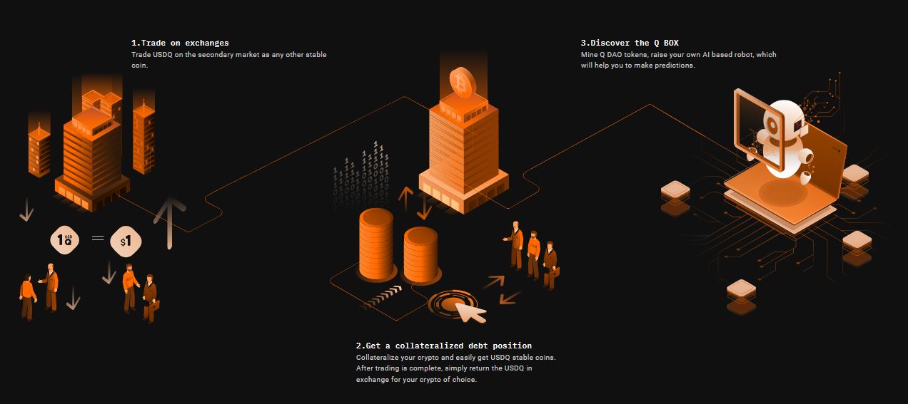 USDQ is a cryptocurrency token that is published on the Ethereum platform, and is a decentralized coin set supported by 10 top cryptocurrency. USDQ can be used as collateral assets (with bitcoin), where users can transfer bitcoin to a bitcoin wallet that is on the Q DAO Platform, then can determine the size of the loan that the user will get. USDQ is now the first stable coin registered on the Bancor Network.