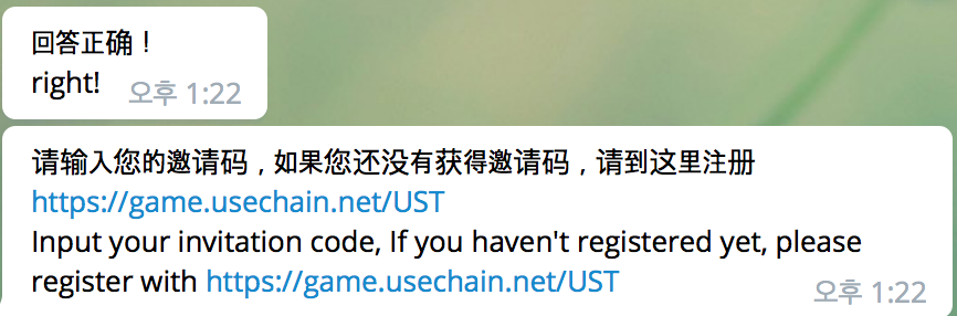 "right!" "Input your invitation code" 2개의 메시지가 나오고 다시 1번 페이지 하단의 【Invitation Code】Send to telegram robot 코드를 채팅창에 입력하면 완료입니다.