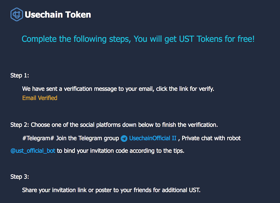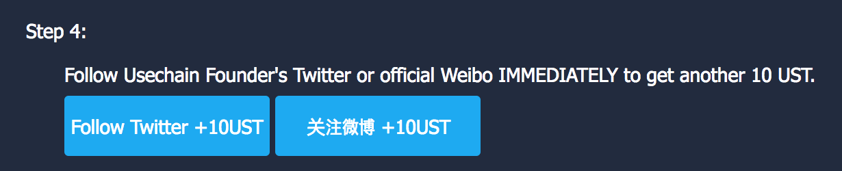 6번까지 총 80UST 토큰이 지급되며, 대시보드 4번 스텝에서 트위터 및 웨이보 팔로우시 각 10UST가 추가되므로 SNS 계정이 있으시다면 이것도 챙기는게 좋겠죠.