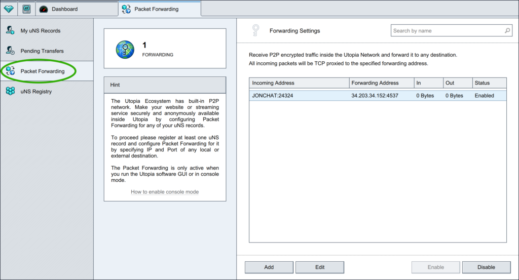 यूटोपिया पी 2 पी नेटवर्क में अपना स्वयं का डोमेन (यूएनएस रिकॉर्ड) दर्ज करने के लिए कृपया टूल मेनू पर जाएं -> यूएनएस प्रबंधक और टैब पर क्लिक करें मेरा यूएनएस रिकॉर्ड