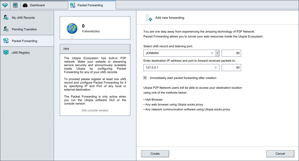 UNS पैकेट अग्रेषण सेटअप पूरा करने के लिए Create पर क्लिक करें।