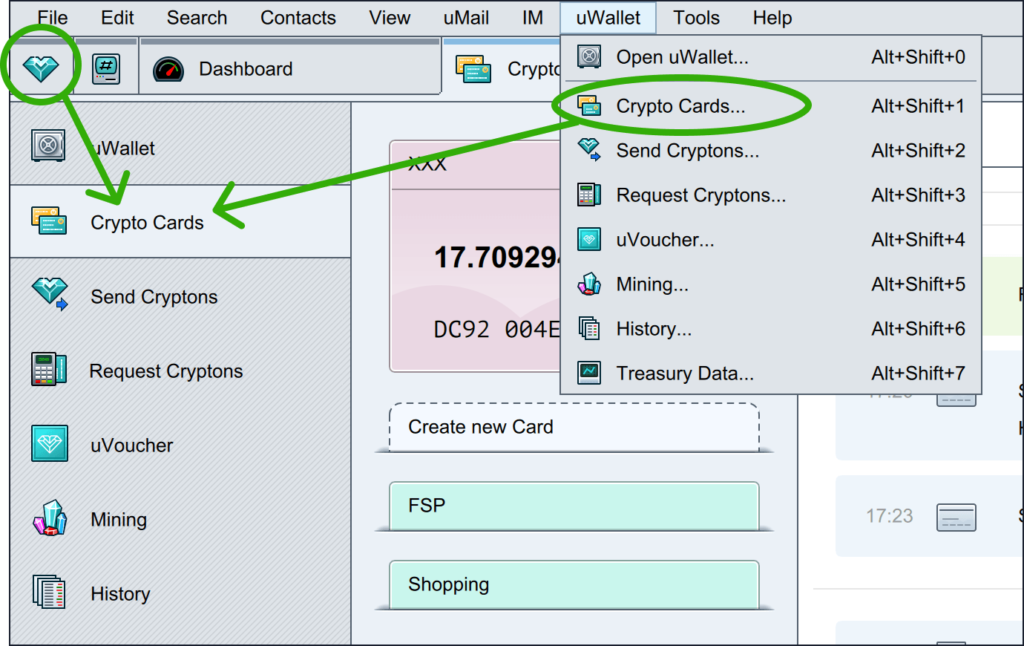 वैकल्पिक रूप से मेनू बार में "uWallet" पर क्लिक करें। "क्रिप्टो कार्ड" का चयन करें।