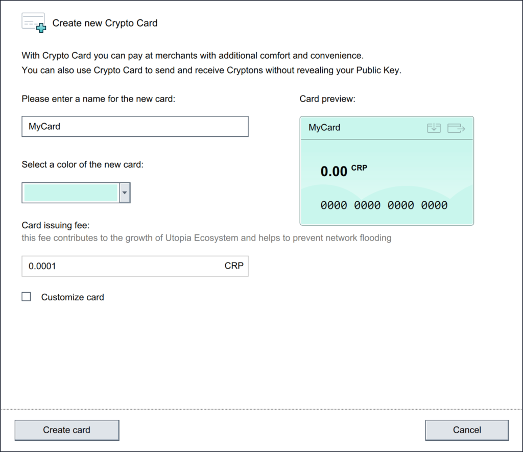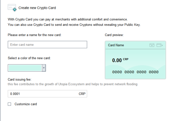 कार्ड का नाम दर्ज करें और एक रंग चुनें। जब आप एक कार्ड बनाते हैं, तो आप पहले चार वर्ण या अंक चुन सकते हैं, यदि आप अपने भाग्यशाली नंबरों का उपयोग करना चाहते हैं या केवल भीड़ से बाहर खड़े होना चाहते हैं। 0.0001 सीआरपी का एक कार्ड जनरेशन शुल्क लागू होगा। यह शुल्क यूटोपिया पारिस्थितिकी तंत्र के विकास में योगदान देता है और नेटवर्क बाढ़ को रोकने में मदद करता है।