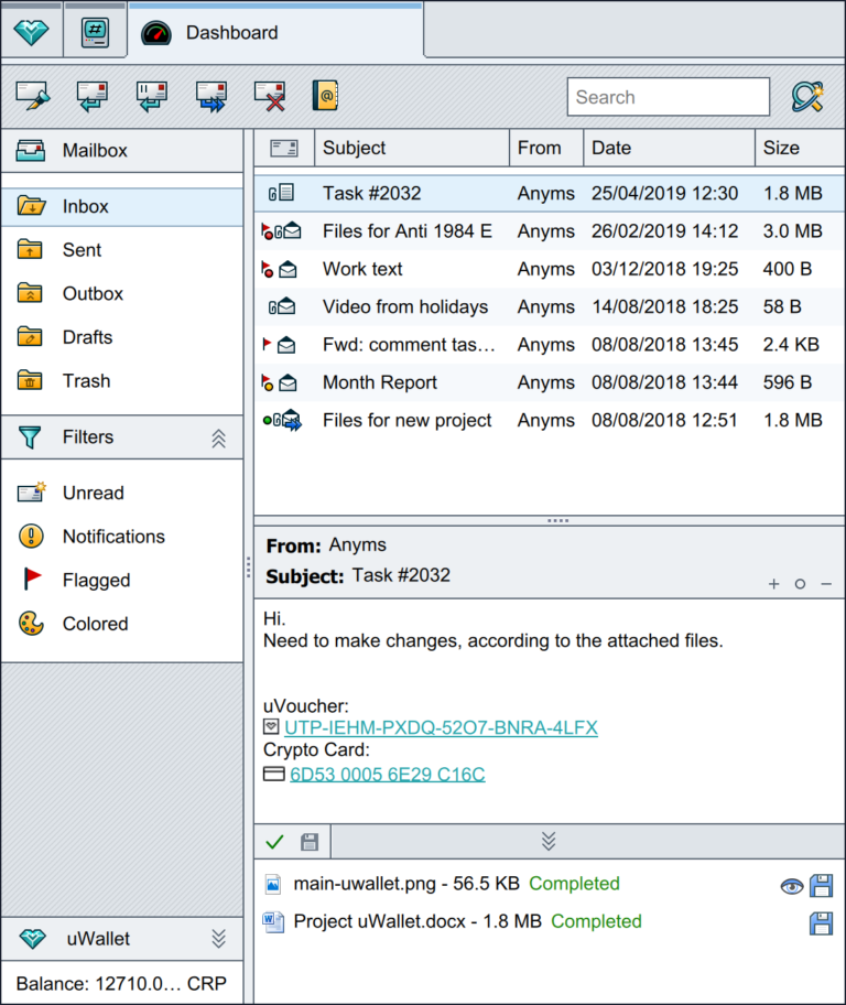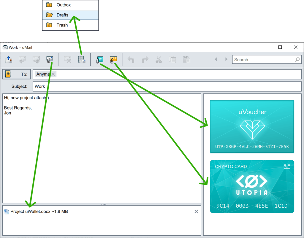 uMail क्लासिक ई-मेल का एक सुरक्षित विकल्प है। uMail को यूटोपिया उपयोगकर्ताओं को भेजा जा सकता है जो केवल आपकी संपर्क सूची में हैं। uMail में यूटोपिया पारिस्थितिकी तंत्र के लिए स्थानीयकृत ईमेल की सभी कार्यक्षमता है।
