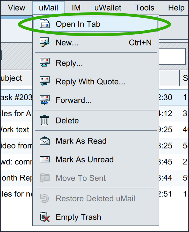नए टैब में uMail खोलने के लिए, मेनू बार में "uMail" -> "टैब में खोलें" पर क्लिक करें