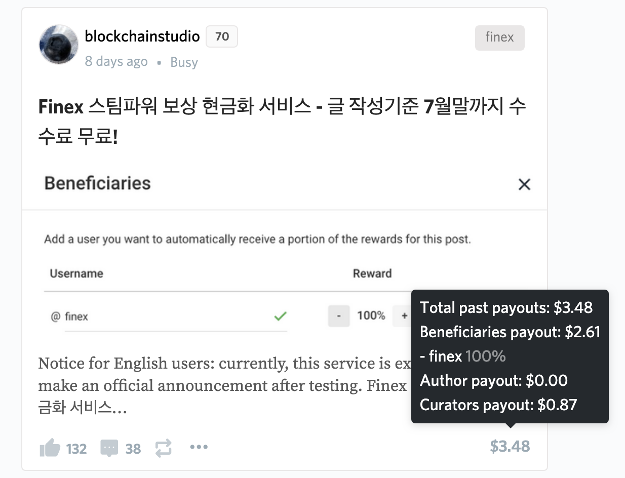 그럼에도 불구하고 스팀블록체인 포스트 정보의 바보같은 설계 덕분에 베네 보상을 쉽게 보여줄 길이 없었습니다. 그런데 이걸 estimation으로 보여주는 기능을 추가 한 것입니다. Finex 스팀파워 보상 현금화 서비스 - 글 작성기준 7월말까지 수수료 무료!와도 관련된 제안입니다.