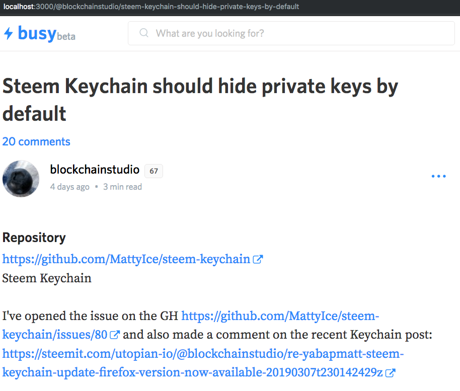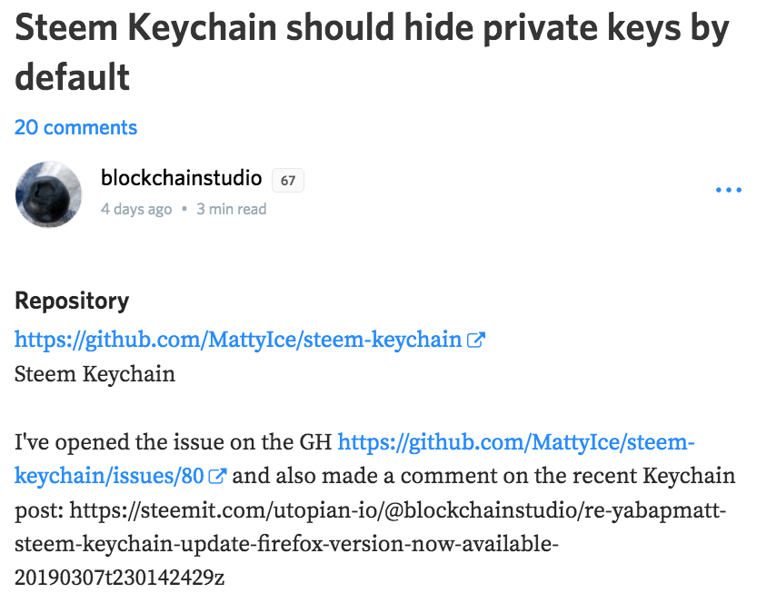 e.g., https://busy.org/@blockchainstudio/steem-keychain-should-hide-private-keys-by-default