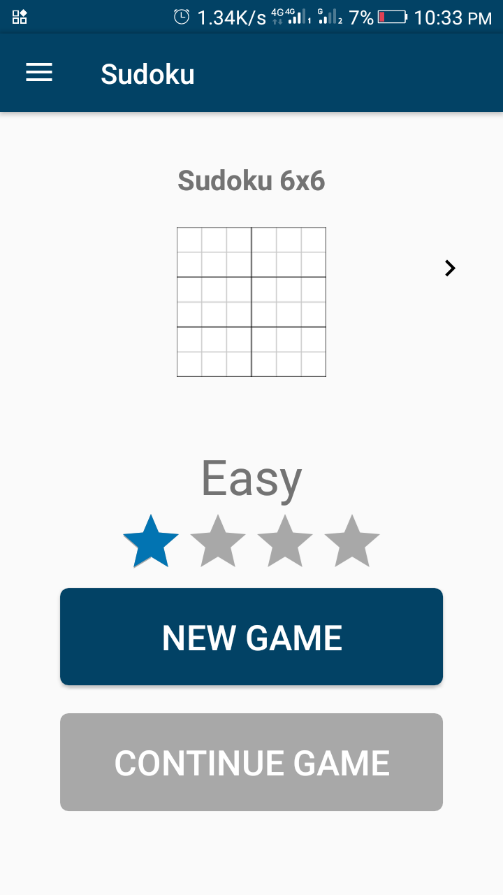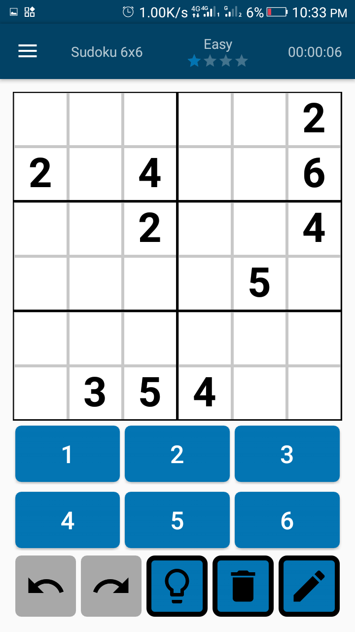- Users can select the type of board they want. I have never seen any Sudoku game that allows its user's to select the type of board they want to play on. After launching the game and going through the normal intro feature, I discovered that I could select a 6 by 6, 9 by 9, or a 12 by 12 board. I also saw some stars below which is meant for setting the game difficulty. For a start, I selected the 6 by 6 type of board and set the difficulty level to easy.