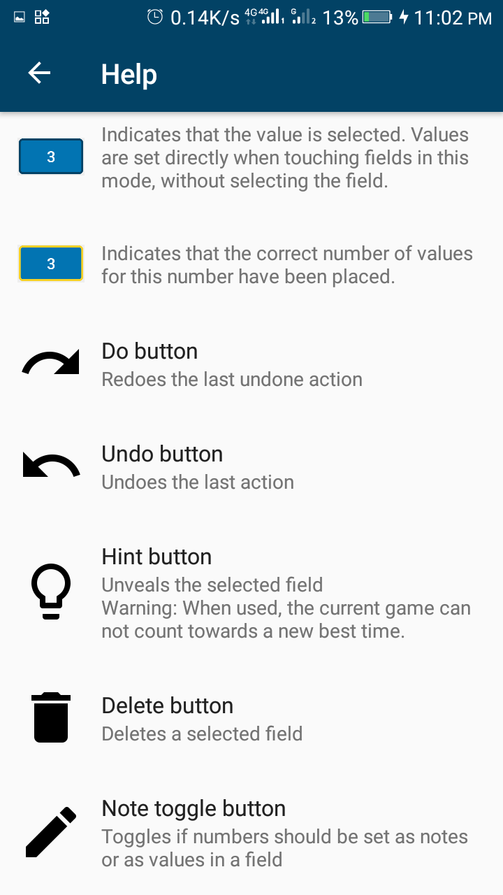 - The game: A lot of features are embedded in the main game. Firstly, there are numbers on the game screen. These numbers are directly under the board and are used to input digits into the board. Looking below the numbers, there are 5 buttons. The first button redoes the last undone action. The second button undoes the last action. The third button is a hint button; it unveils any selected block. The fourth button is to delete any digit on the board. While the fifth button is a note toggle button; toggles if digits should be set as notes or as values in a block.