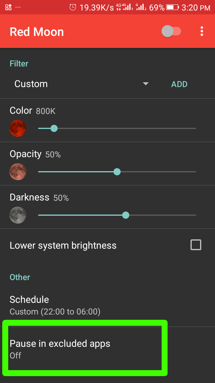 - 'Pause in excluded app' feature is available in both apps but Blue Light Filter app requires manual operation while Red Moon app does it automatically.