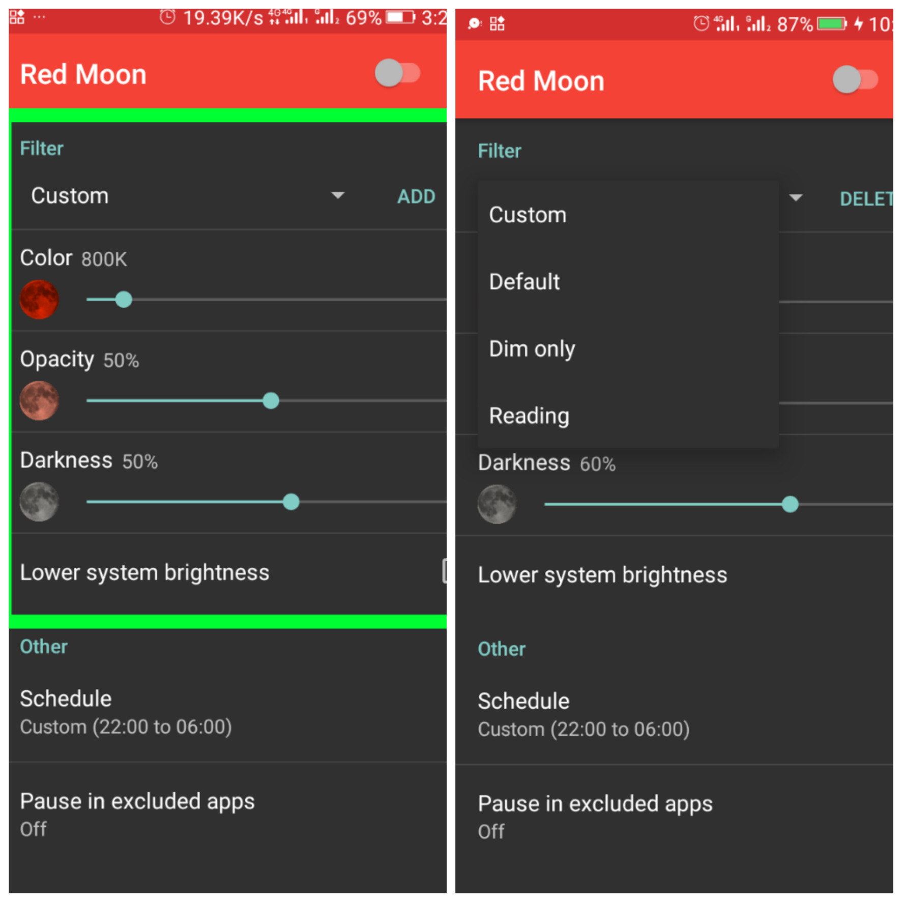 Comparing Red Moon app with Blue Light Filter app (a similar app)