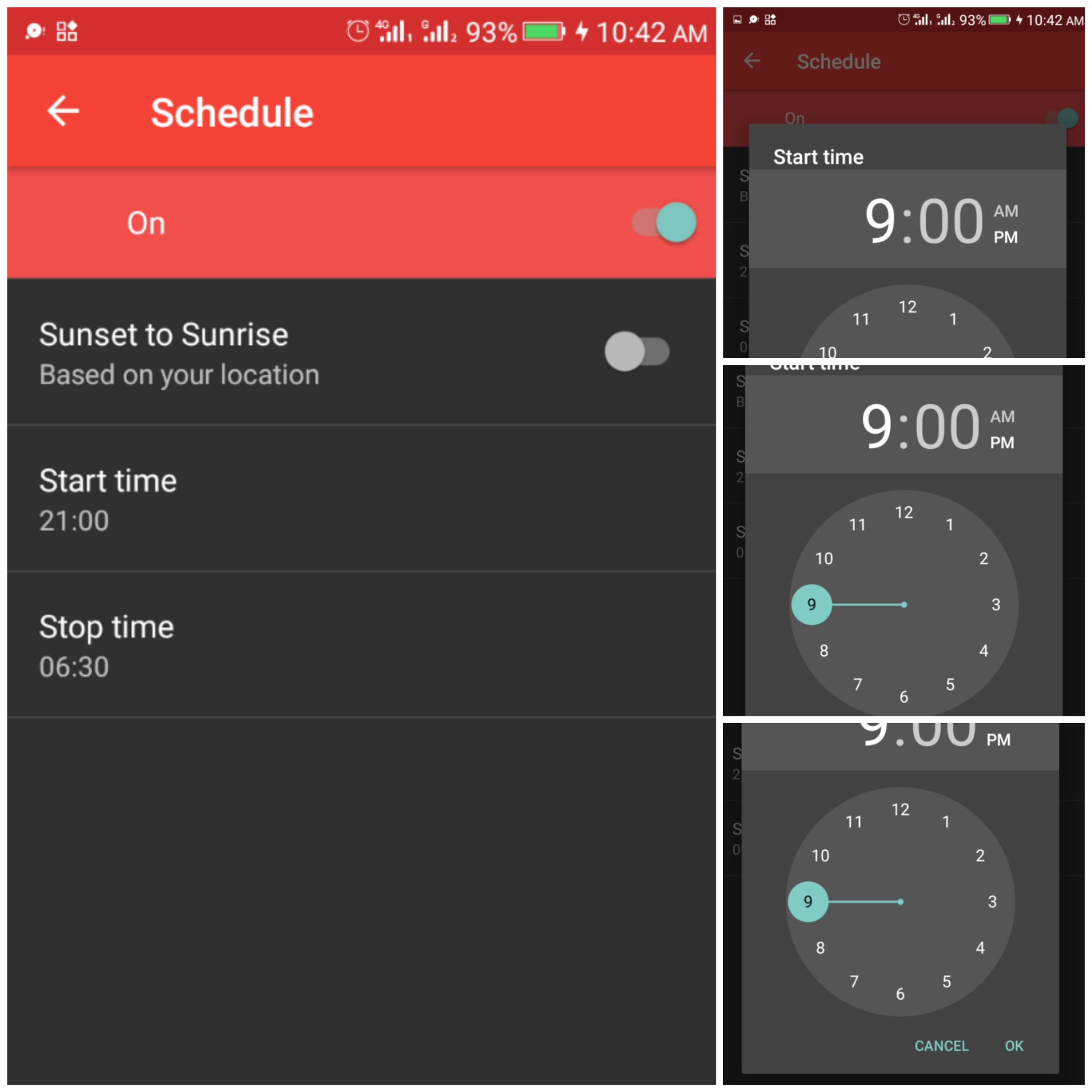 - Schedule: This feature allows you to schedule the effect of the Red Moon app. You can either schedule the effect from sunset to sunrise (based on your location) or by setting it up manually (setting your preferred start time and stop time. Clicking on the 'Sunset to Sunrise' option will require you to turn on your location so Red Moon can know when it's sunset and sunrise in your location. I prefer scheduling the effect manually (which I did already). I set the start time to 9:00pm and my stop time to 6:30am because between 9:00pm and 6:30am, my dad requests the lights to be turned off.