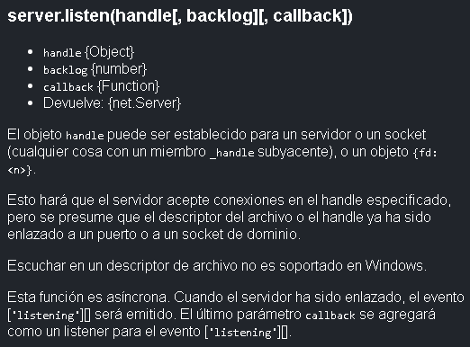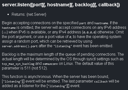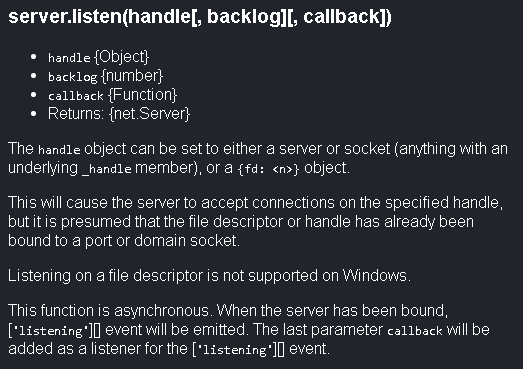This function is asynchronous. When the server has been linked, the ['listening'] event will be issued (Emitted when the server has been bound after calling server.listen). The last callback parameter will be added as a listener for the ['listening'] event.