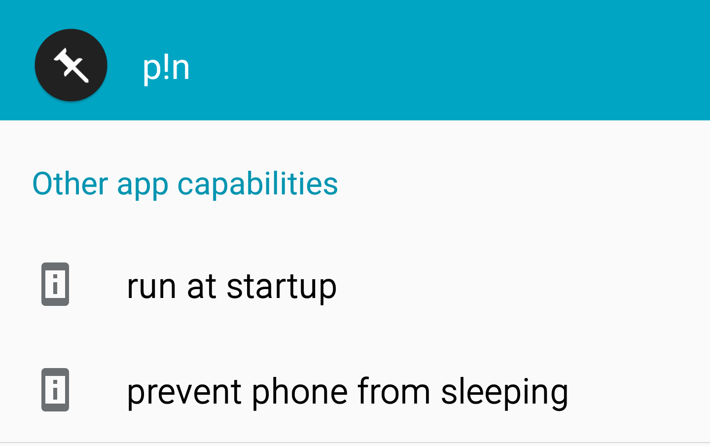 P!n doesn't need any permission for it to function properly on an android device. It only needs to be able to run at startup and to be able to prevent phone for sleeping. I was delighted to see that it doesn't connect to the Internet, as I'm concerned with how much information is shared from my phone.