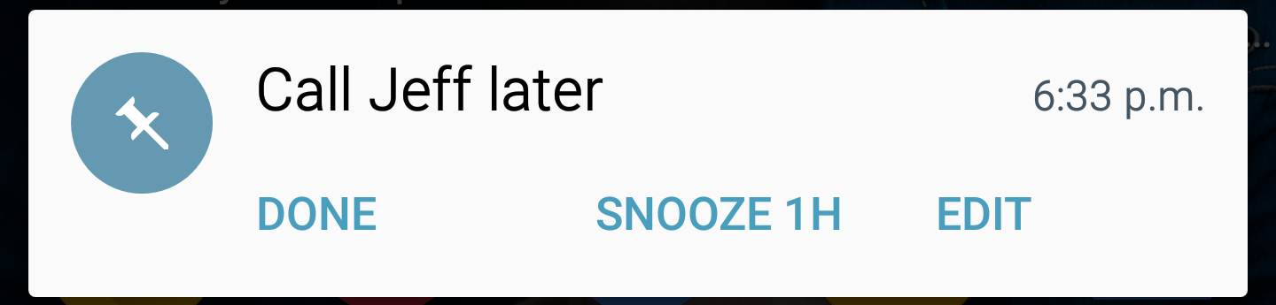 When creating a note with P!n, a user can only set the note to last for 30 minutes, 1 hour, 6 hours, or 24 hours. For example, you want a note to last for less than 30 minutes, you would have to use the "done" option when the note is redundant. Or simply swipe to left or right, as that helps removes the note from the notification panel.