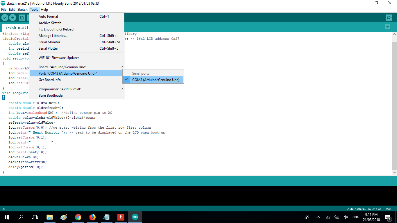 In the code we have used analog read function to read output of Heart Beat sensor module which is connected to a0 of the arduino, when making a code we need include all the libraries we will be using we have to add the library that we have recently downloaded. #include <LiquidCrystal_I2C.h> for the i2c 2x16 LCD DISPLAY. and the #include <Wire.h> which is already in the IDE.The address LiquidCrystal_I2C lcd(0x27, 2, 1, 0, 4, 5, 6, 7, 3, POSITIVE); is the i2c address woth only 4 pins, if your using the 16 pin then you need to use different address here.setup() method is ran once at the just after the Arduino is powered up and the loop() method is ran continuously afterwards.