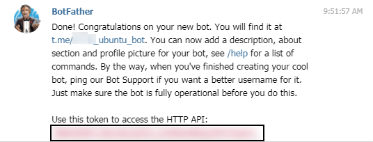 Copy the token given by the BotFather and paste it to the command line window and you will see a message from command line window like: