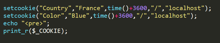 I have created two cookies the first for the country and the second for the color , I will print it using the $_COOKIE array and this is the result