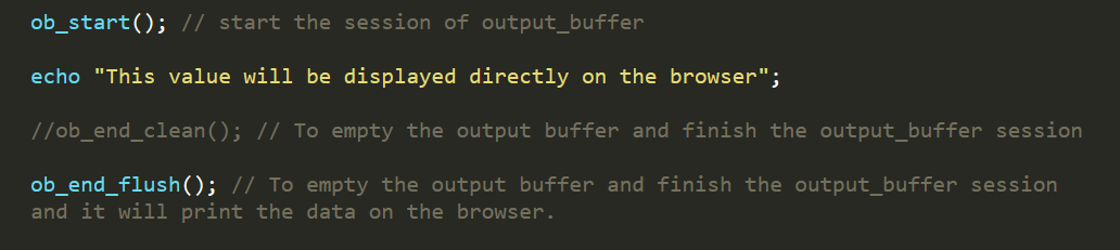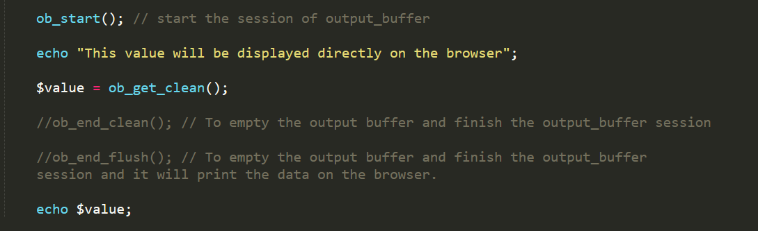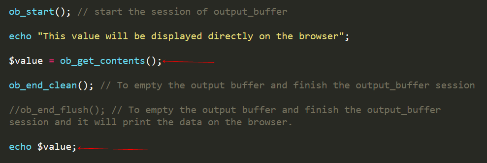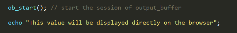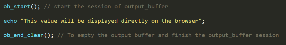 I will continue in the same example I will use echo to print "This value will be displayed directly on the browser" , after that I will use the ob_end_clean() function