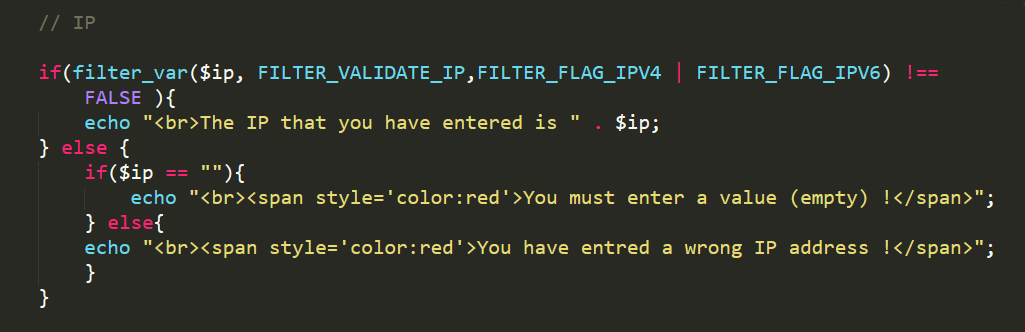 This number has two versions , ipv4 and ipv6, to manually check the value that the user entered is very difficult and for that PHP offers a very important type of filtering 'FILTER_VALIDATE_IP'.