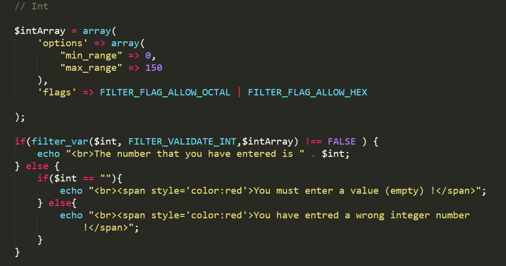 And by default it doesn't accept numbers in octal and hexadecimal representation, but we have two flags to allow the user to enter these representations in this input " FILTER_FLAG_ALLOW_OCTAL " and " FILTER_FLAG_ALLOW_HEX ".