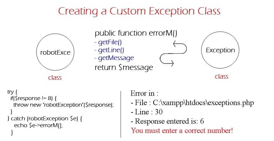 Since this class inherited from the old class 'Exception', it takes by default all the methods of the parent class like 'getLine (), getFile () ..etc' that we will use in our own function.