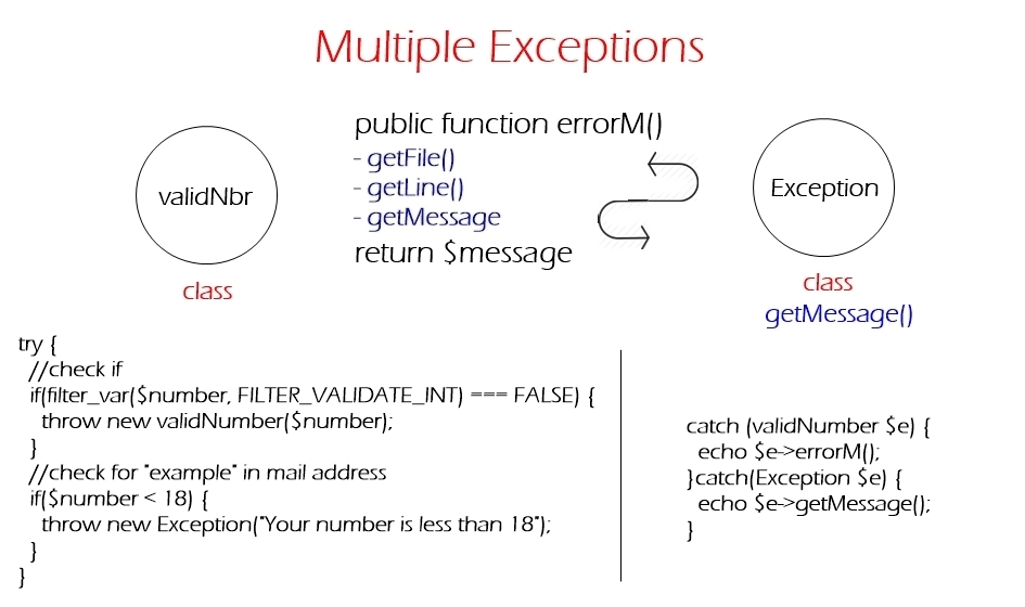 If we have more than one condition or we can say more than one exception, can we manage them? simply "yes", PHP offers the mechanism of ' Multiple Exceptions '.