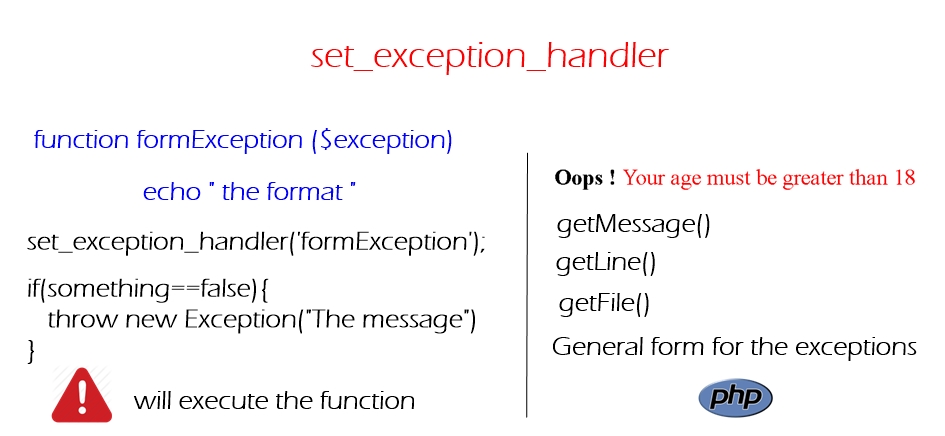 Before executing this function we must use " set_exception_handler() " to add this function or this exception to the old ones, and we will use the " throw new Exception" with a message to use it in the function.