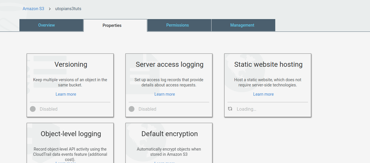 Click on the Static website hosting tab to retrieve your Endpoint url