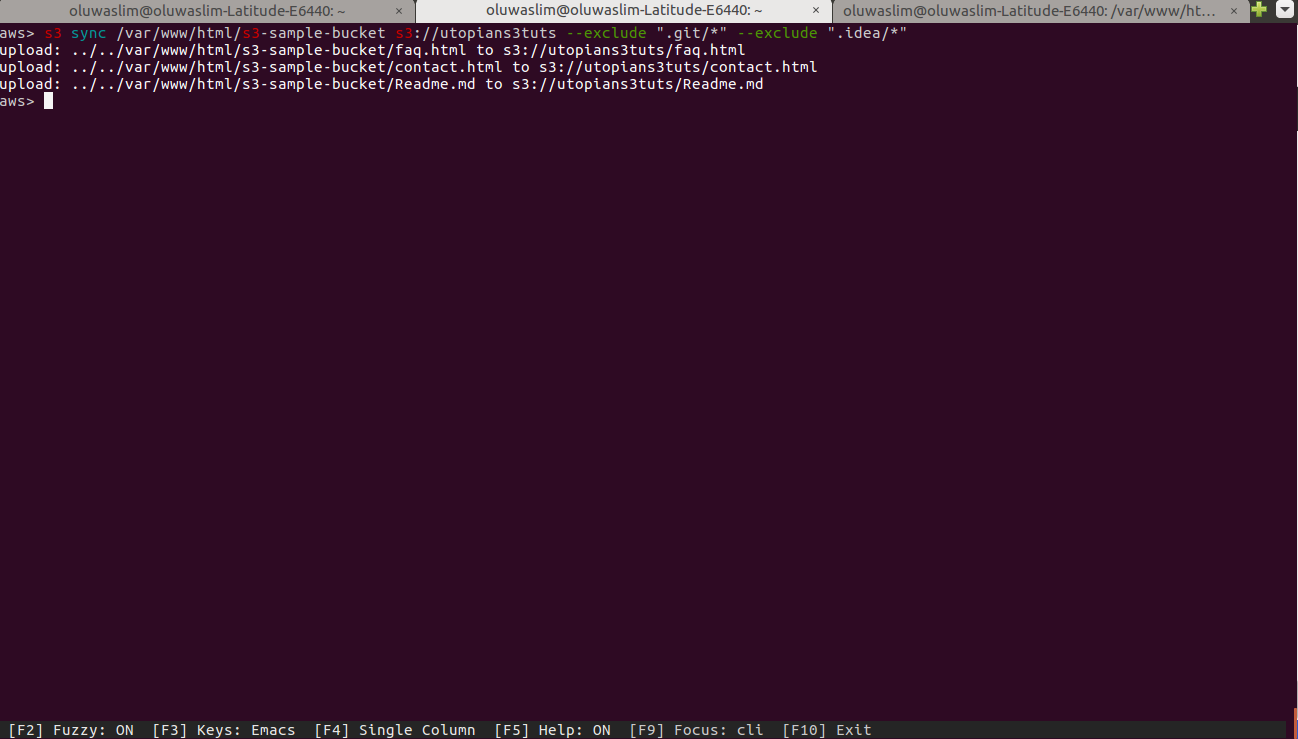 To round up this tutorial we need to add a few files to our local directory, and then sync to the s3 bucket to see how the updating of the site using aws-shell works. In my case i will be adding contact.html , faq.html, copy the content of index.html into them, then a readme.md file with the content of this tutorial, then from the aws-shell window in terminal run command