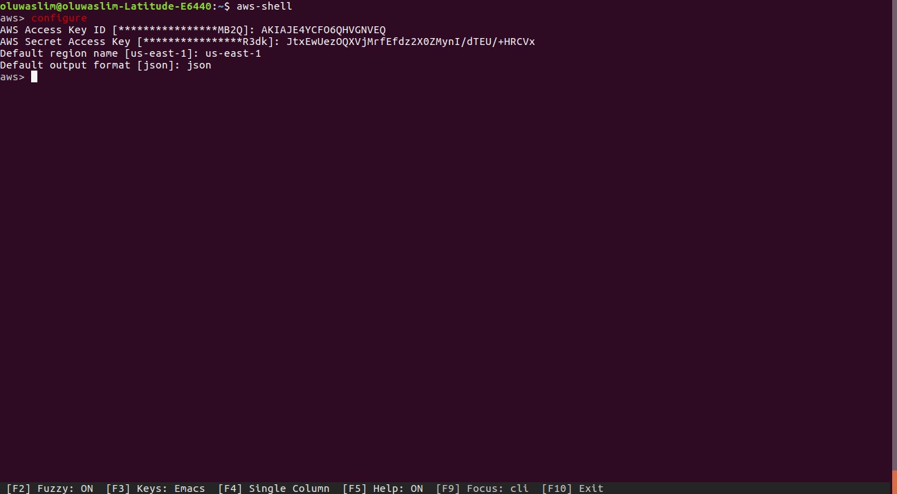 Next we need to configure aws-shell with or new user details. If you are still in the aws shell(if not run aws-shell to go back then) run command configure and follow the prompt.