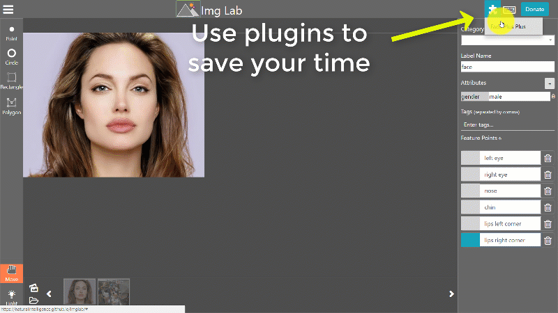 Using Imglab is fairly simple. You have to import the images and start annotating them. Feature points can be drawn inside any other shape. When you select a shape, you can provide annotation detail in right side panel. Finally you can save all the data in your desire format.