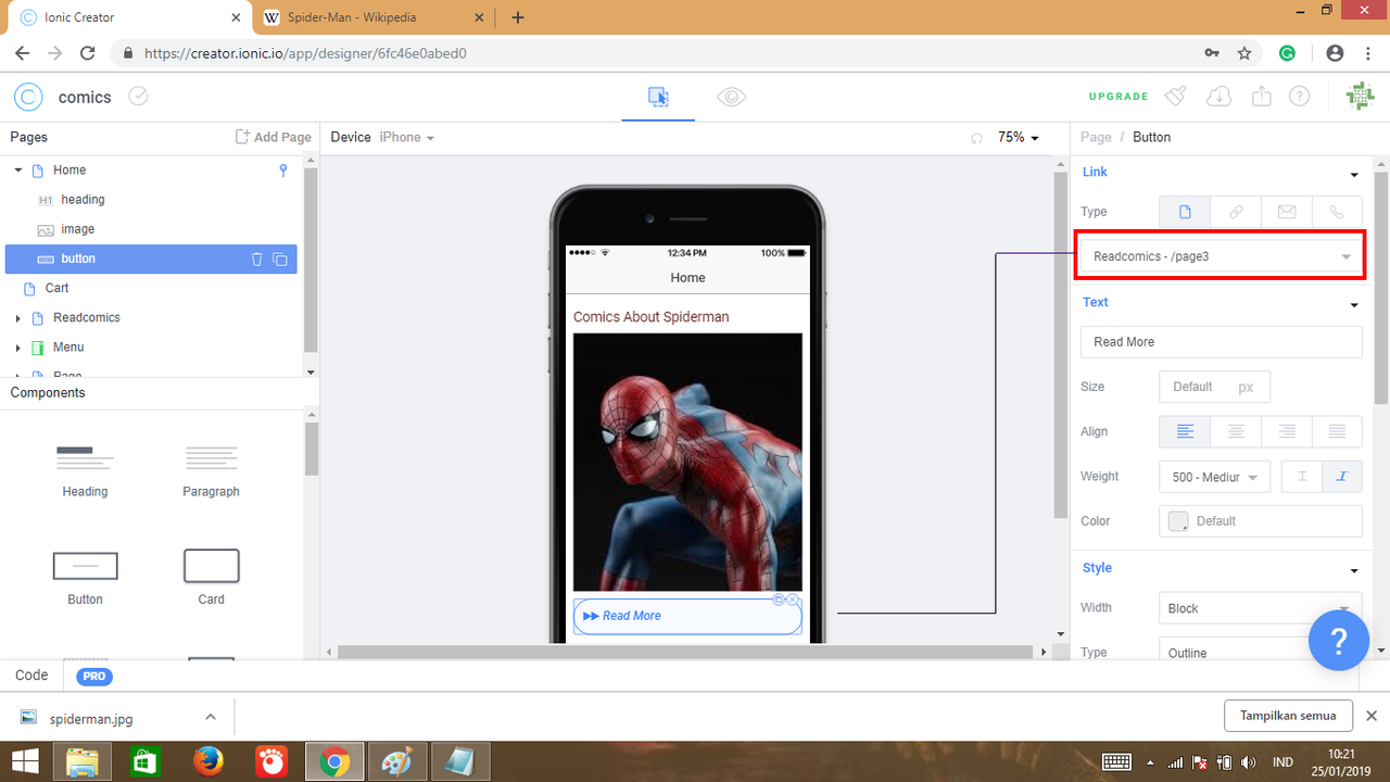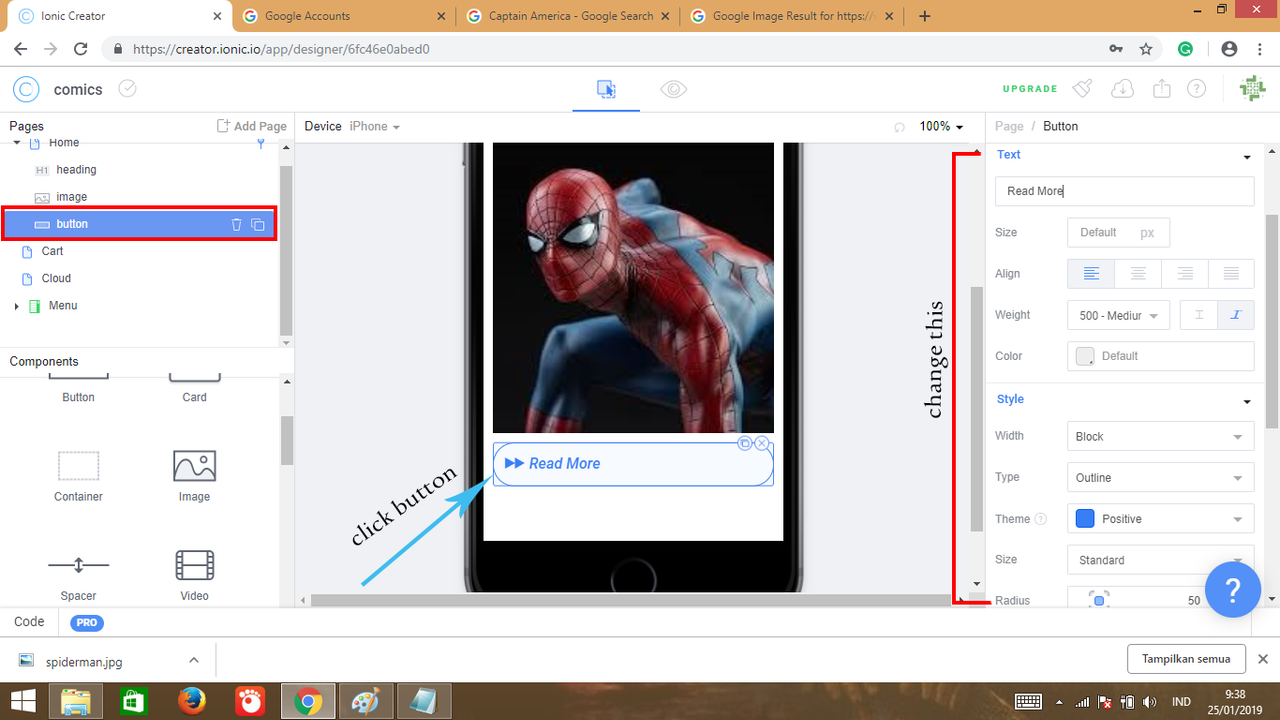 9. Next step I will add button component, so drag & drog it to home page and theming it with set a text, size, align, weight & color (styling text of button), change type & size, color theme and radius of button (styling button).