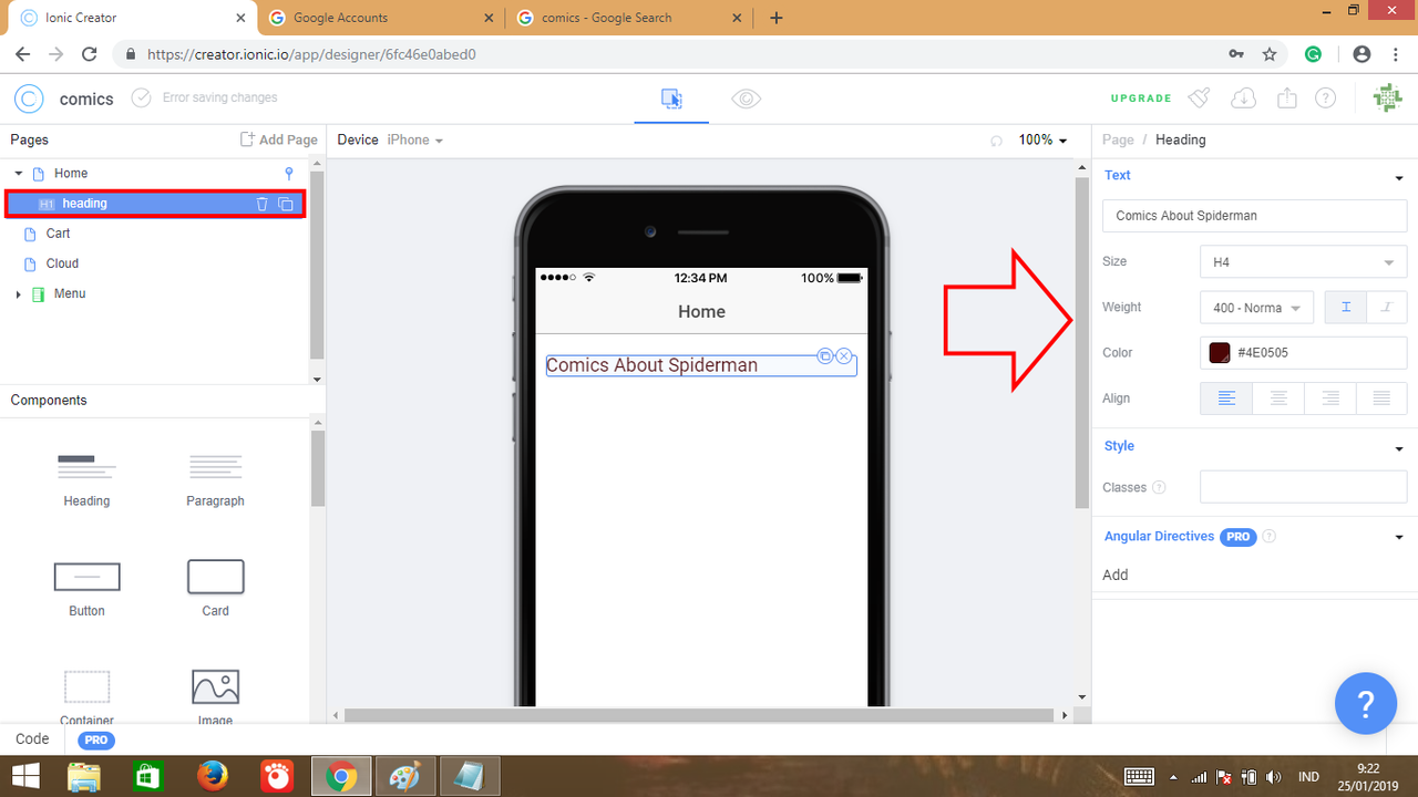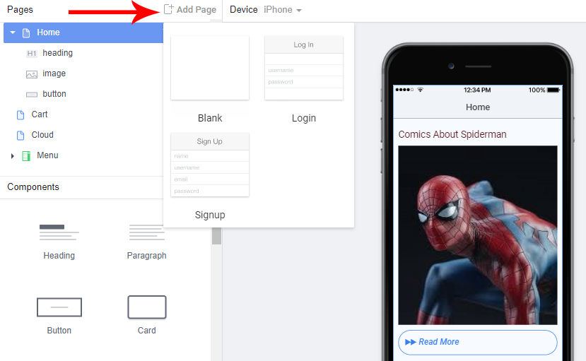 6. Ok first I will design home page, I want to add the heading, image and paragraph component. So select Home then drag&drop heading component to page.