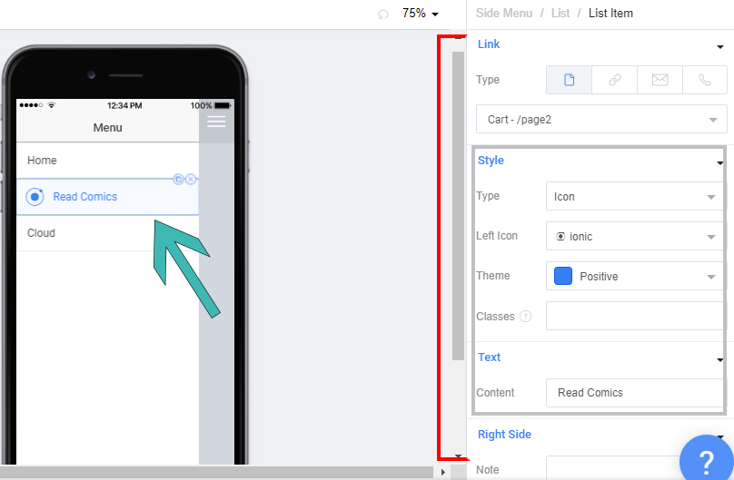 10. Now I will open menu page, I want to change list item of list of side menu ( i want to change chart list). Ok, click chart list. I will set list item with an icon. So choose an icon (left icon), set theme (positive theme) & don't forget put text on your list item.