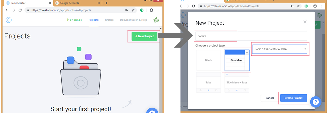 3. To start your first project --> click New Project --> Put your project's name. Then choose one of 4 templates there then click create a project. I choose Side Menu template and Ionic Version 3.