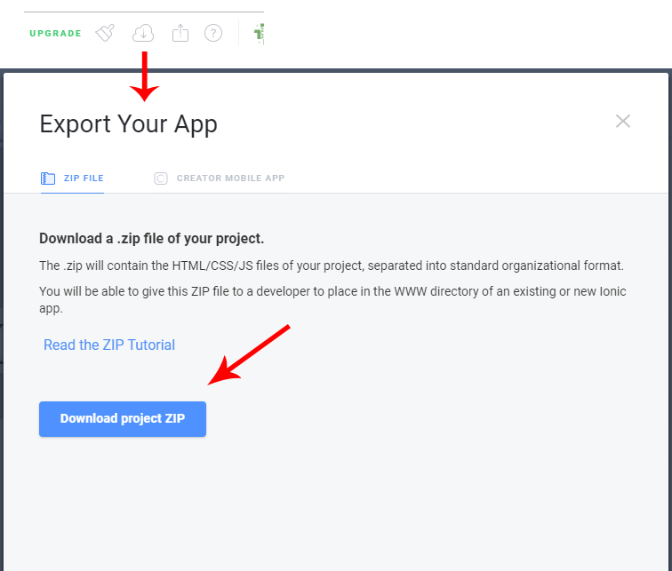 14. Ok, export our project to set at our local directory. Click "Export your app" and then click "download zip project"