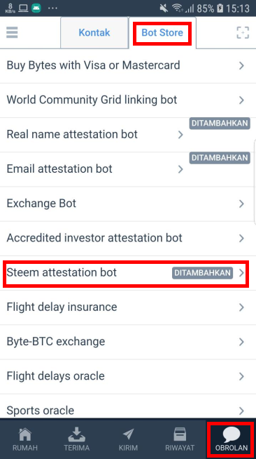 Next after getting a donation, please tap on the chat menu. At the top Select "Bot Store". Then a list of bots can be used. Then tap on Bot "Steem Attestation Bot". Consider the following picture: