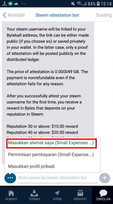 In a few moments after the Bot "Steem Attestation Bot" was chosen, it would display a description of the program to give free byteball to one million users of Steem. The number of free Byteball will be distributed based on the reputation you have on the Blockchain Steem. Reputation above 30 gets $10, above 40 gets $20, above 50 gets $40, above 60 gets $80 and reputation above 70 gets $160. What needs to be remembered is that this event is only for the first million accounts that carry out Wallet Byteball registration and connect with the Steem account.
