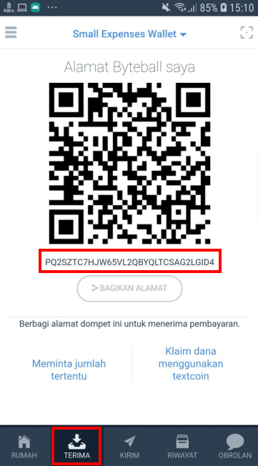 Next, please enter the wallet address (Small Expense Wallet) by tapping on the three point icon in the lower left corner, select the "Small Expense Wallet" option. Then it will automatically be sent the wallet address needed by the Bot.