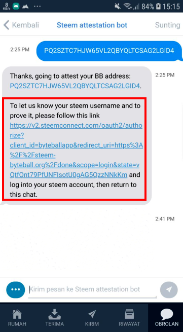 After the address "Small Expense Wallet" is sent, the Bot will respond in the form of an order to connect to the Steem account. In this process Byteball has used the Steemconnect application so users don't need to worry about the password or key used.