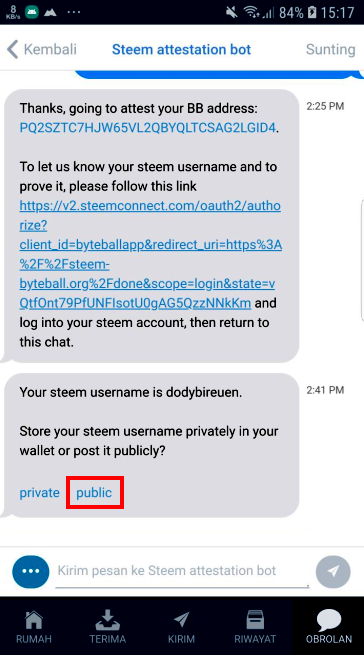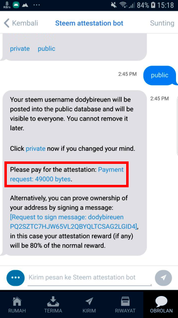 After making the "public" option as the place to store the account, then the bot will direct to make authentication payments. This is where a donation or loan of 0,0006 GB (Gigabyte) is needed to pay for the approval of the transaction contract bybyteball. Please tap on the words "Payment Request: 49000 bytes".