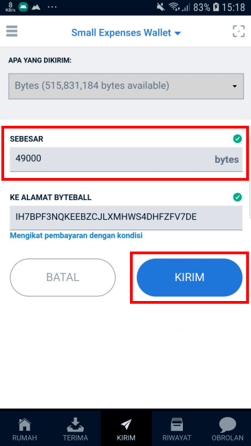 The Byteball application will display a payment page as shown in the example image below. Users only need to tap on the send button, the payment transaction will occur at a cost of 49000 bytes.