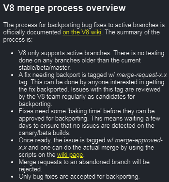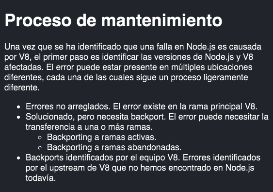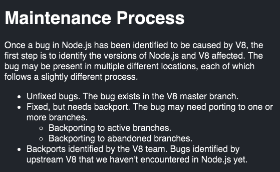 I started the translation of the folder Maintaining.V8.md. As the name implies, it contains information on the maintenance of V8 and attempts to document the current processes to maintain the branches of V8 in Node.js, as well as to consider how the Node.js and V8 teams can help in Google.