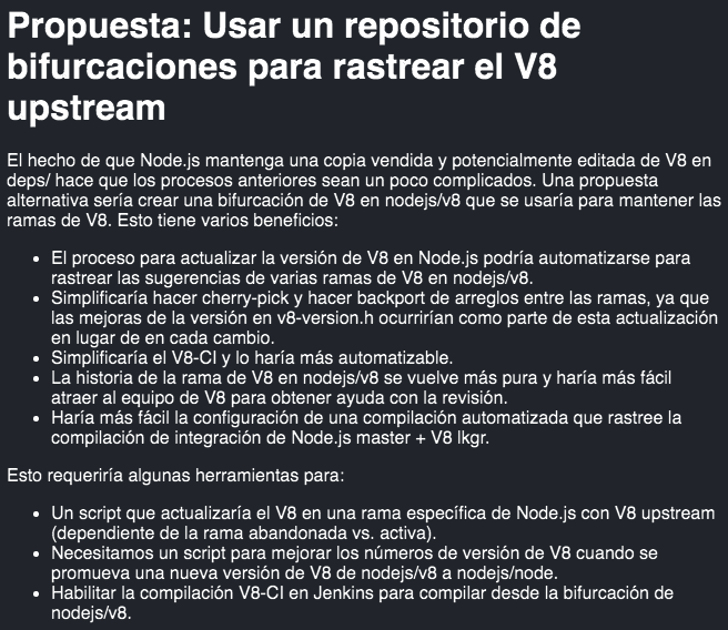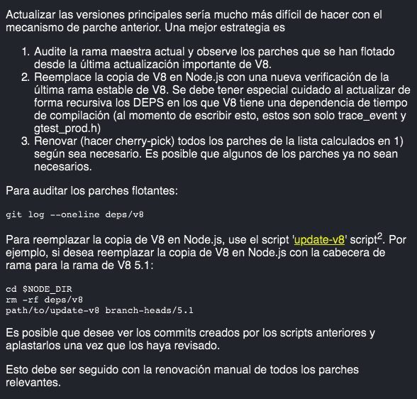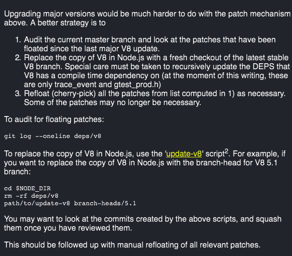 As the name implies, it contains information on the maintenance of V8 and attempts to document the current processes to maintain the branches of V8 in Node.js, as well as to consider how the Node.js and V8 teams can help in Google.
