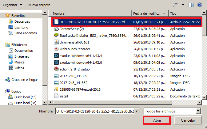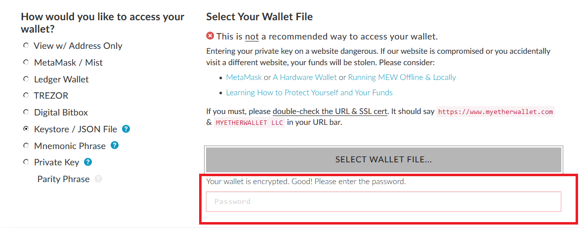 Nosotros vamos a elegir la opción "Keystore / JSON File " y "select wallet file".