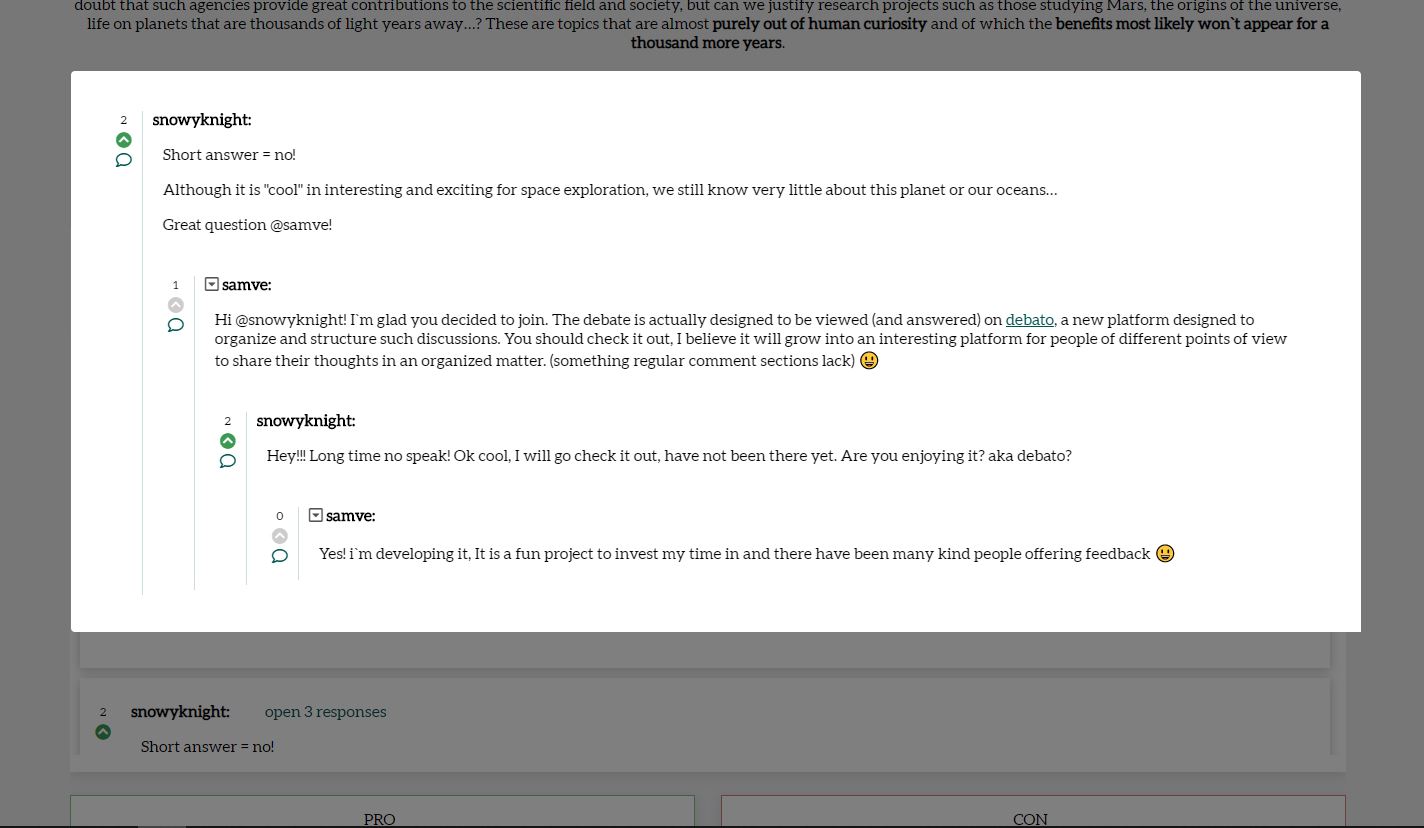 Further improvements have been made on debato.org. New features have been added and existing functionality has been expanded with the aim of providing a pleasant user experience and to promote discussions on the Steem blockchain.