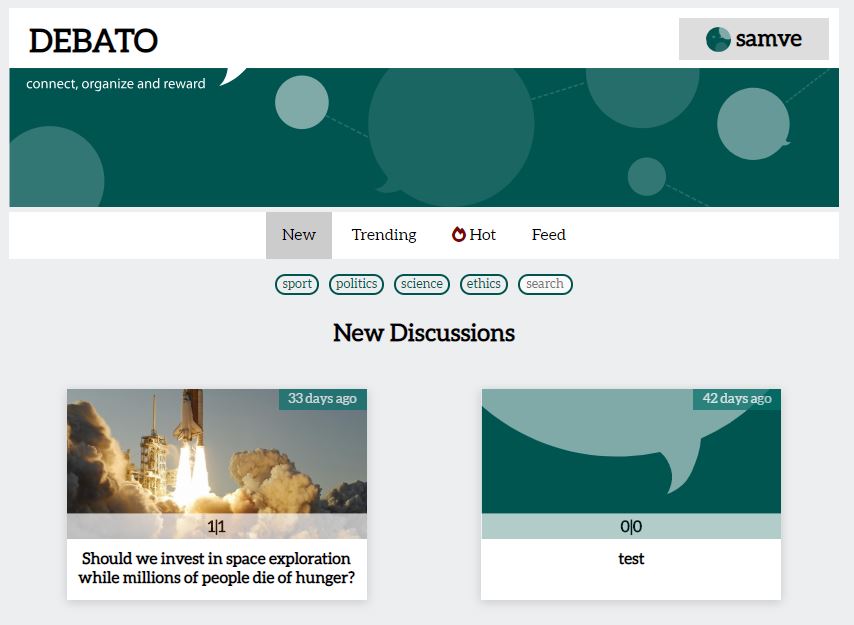 Debato is an online platform that accommodates online debates on topics big an small. We are all passionate about certain topics and inevitably it can happen that a difference in opinion leads to conversations that resemble a bottomless pit of arguments and acquisitions. This results in many people not even getting involved or finding it a waste of time to formulate their points of view. By filtering the thoughtful arguments and by structuring arguments and sub-discussions, debato allows anyone to share their thoughts and points of view in a clear way. And why stop there? Because debato is built on the decentralized Steem blockchain, writing thoughtful and interesting arguments or discussions gets rewarded as well.